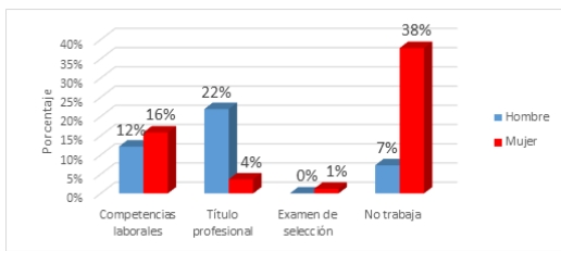 Sin embargo, como se muestra en la Gráfica 7, las mujeres que encontraron empleo enfrentaron requisitos de contratación más rigurosos que los hombres: las mujeres fueron contratadas a partir de la demostración en la práctica de las competencias adquiridas en su formación y de exámenes de selección, mientras que para el 22% de los egresados hombres la obtención del empleo se basó en la presentación de su título profesional (a diferencia del 4% de las mujeres con la misma condición académica), lo que apunta a que los hombres titulados se someten a menos presiones y por tanto se les brinda más oportunidades de contratación.