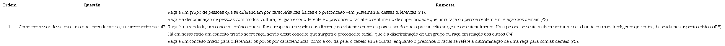 Partindo da compreensão de que raça deve ser uma palavra que ressignifique união e igualdade e não algo que compactue com as diferenças humanas, assim, pode-se concordar com a fala de Bento (2011, p. 41) quando diz que diversas “pesquisas concluíram que não existem diferenças biológicas entre os seres humanos, ou seja, há somente uma raça: a humana”. Pensar de outra forma, em relação aos grupos sociais ou “raças” - assim como muitos definem - e o mais grave é que sendo esse sentimento passado de geração para geração e reproduzido na escola, acaba se tornando uma questão muito difícil de ser extinta da sociedade. A nomenclatura (racismo) vem da palavra raça e surge, devido ao entendimento de que existem diferentes raças, cujas características se diferem. E essas diferenças existentes entre os grupos produzem o sentimento de superioridade e consequentemente dos preconceitos e discriminações. Por isso, há necessidade de se pensar sobre o entendimento do que são raça e racismo na óptica dos professores elaboramos uma questão que patente na segunda coluna do quadro 1 indagava.