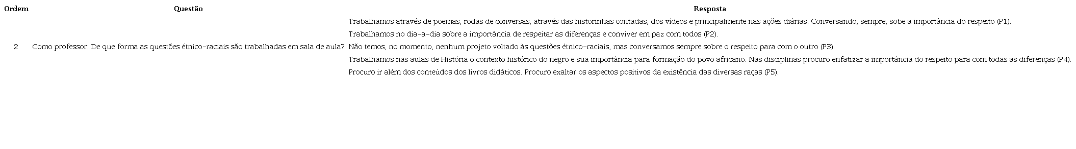 A discussão dos resultados foi feita baseando-se nos seguintes aspectos: a) percepção dos professores sobre raça e preconceito racial; b) percepções dos professores sobre a forma que as questões étnico-raciais são trabalhadas em sala de aula; c) nível de preparação dos professores em trabalhar com questão étnico-racial e; d) percepção dos professores sobre o papel de formação dos alunos em matéria de preconceito racial na sala de aula e na escola.