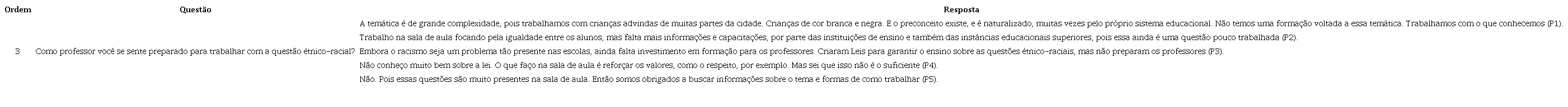 As respostas apresentadas no quadro 3 demonstram a necessidade de mudança na situação, de um maior conhecimento sobre a lei e também que as políticas voltadas para uma maior capacitação do professor sejam desenvolvidas. Os professores têm consciência de que há uma necessidade de se promover mudança no cenário educativo, no que concernem as questões étnico-raciais, porém o sistema educativo não tem promovido as oportunidades necessárias. O receio do despreparo e a limitação nas respostas dos professores dificulta o enfrentamento para a elaboração de novos meios de aprendizados, pois o professor acaba acreditando que o que tem, é por hora, suficiente. Ainda existe outro ponto, sabe-se que só é possível transmitir aquilo de que se tem amplo conhecimento. O professor vai passar para os alunos, por meio das aulas ou do comportamento, seus valores, suas crenças e tudo aquilo que conhece e acredita (Rauem; Verillo, 1991).