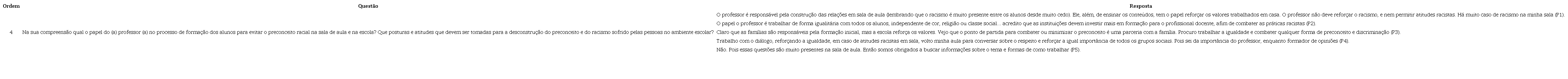 Nas respostas elencadas no quadro 4, percebe-se que ainda há muito a se pensar no processo de construção das relações em sala de aula e nas práticas educativas. Segundo Cavalleiro (2004) as atitudes comportamentais, do professor em sala de aula, podem produzir nos alunos efeitos psicológicos gravíssimos. Quando o professor faz distinção entre alunos brancos e negros, manifestando carinho, atenção, cuidados diferenciados, mesmo que inconscientemente, pode causar sérios danos a vida dessa criança. Ela acreditará que é inferior e assim se comportará, diante da sociedade. Dependendo da forma como os professores trabalham em sala de aula com seus alunos sobre as questões étnico-raciais, pode disseminar o preconceito e a discriminação e, por via disso, prejudicar o processo de identificação da criança com suas origens. A partir das respostas dos professores, nota-se que quando se fala de atitudes preconceituosas, racismo, discriminação racial sempre são direcionadas para o respeito entre alunos, as diferenças. Assim fica visível que os professores acabam camuflando até mesmo a forma de se expressar. O racismo na escola precisa ser minimizado ou até mesmo erradicado. Para isso, os professores precisam trabalhar na perspectiva de programar propostas metodológicas capazes de propiciar aos alunos o entendimento, a compreensão e sensibilização de que independente das diferenças étnico-raciais, o “ser” faz parte de apenas uma “raça” - a humana, logo, os indivíduos devem cumprir seus deveres e merecem os mesmos direitos, dentre eles, o de ser livres, inclusive de manifestações/comportamento de racismo. Neste sentido, deve-se destacar a necessidade de se formar professores preparados/as para lidar com a diversidade cultural em sala de aula, de se rever materiais didáticos que contenham mensagens depreciativas, mas acima de tudo, viabilizar a utilização de novos currículos, novas abordagens e preparar os docentes para criticar o currículo e suas práticas.