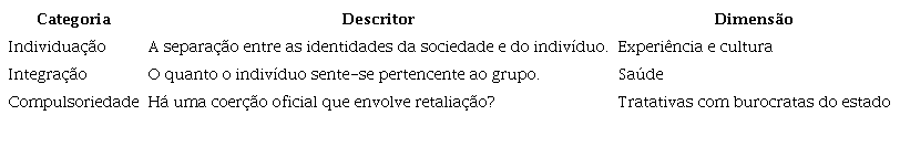 Seria tentador atribuir que a vontade do suicídio no caso estudado seria o número um, porém não é exatamente esse o caso, dado que, evidentemente, não há uma sensação de desencaixe - tanto que eles se autodenominam como “habilidosos”, o que contraria frontalmente o discurso gerontológico, e nesse caso, é preciso pensar um outro subtipo que descreva nosso objeto de estudo. No entanto, para encontrá-lo, é preciso desdobrar o grande conceito em dimensões, como mostra o quadro 1: