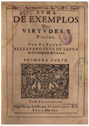 Poco sabemos del P. Alejandro Faya, quien nació en Savona, Italia en 1567, ingresando a la provincia jesuítica del Perú a fines de 1691. Llegó primero a Córdoba donde fue ministro del Noviciado y luego pasó a Santiago de Chile el 29 de noviembre de 1607. Como hemos dicho, junto con el P. Pastor, fue a Mendoza en 1609, donde estuvo poco más de un año, ya que enfermó y partió a Santiago, donde profesó sus últimos votos el 30 de enero de 1611. Sabemos que falleció en Lima el 6 de noviembre de 1640, cuando contaba con setenta y ocho años de edad (Storni, 1980). Allí escribió tres tomos titulados “Suma de exemplos de virtudes y vicios”, impresos en Sevilla en 1632 (Imagen 5), aunque con licencia del provincial del Paraguay Pedro de Oñate de 1626 y por sugerencia del provincial del Perú Juan Frías Herrán y dos lectores de teología. En la Carta Anua que escribe el provincial Mastrilli Durán de 1641 inserta su obituario, donde expresa que: “trabaxo en tucuman, y en el Reyno de Chile, aprendiendo y sabiendo lengua de indios y últimamente baxo a esta ciudad el año 1613 y donde entonces ha vivido en el Noviciado”, donde era ministro. Agrega que: “Fue hombre pobre y humilde a maravilla. El jubón que dexo lleno todo de remiendos y roturas y costuras” (ARSI, Perú 15, f. 67).