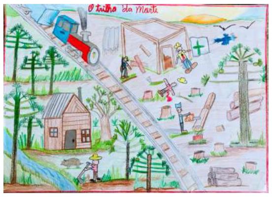 O desenho do Mateus foi a porta de entrada que escolhi para acessarmos o universo da imaginação infanto-juvenil do Contestado. No início desse texto comentei que cheguei a essas pequenas pérolas por meio dos algoritmos. Eram mais de trezentos desenhos. Havia um concurso. Vagueando pelo feed da rede social os desenhos chegaram até a tela do meu computador. Ao observá-los, deixei de lado a seleção oficial efetuada pela Associação e passei a me concentrar nos traços, nas cores e na narrativa. Naquele momento “o trilho da morte” de Mateus me escolheu. Fiquei impressionado com as minúcias e com as cores, mas principalmente com o fato dele ter colocado duas temporalidades em uma superfície plana. Além disso, enxerguei no desenho de Mateus uma narrativa que muito se assemelhava às melhores abordagens historiográficas do Contestado: denúncia política, indicadores dos elementos causais que contribuíram para a emergência do conflito, a crítica aos ideais de progresso, a violência desmedida das forças de repressão.