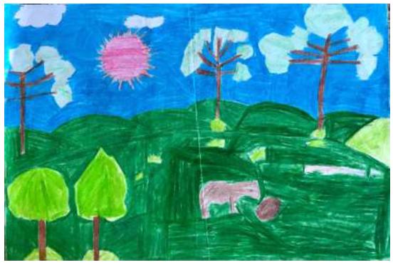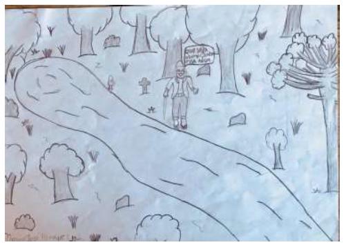 Junto ao desenho reproduzido no Facebook tinha uma legenda com a autoria, idade e nome da escola do autor/a. Por sorte tinha entrevistado uma professora da escola do Mateus semanas antes2. Foi assim que outra história, também imprevista, se desvelou. A professora não só conhecia Mateus, como me passou o histórico de sua família. Ele é neto de pequenos agricultores e estuda na escola Trinta de Outubro, uma escola rural que fica a poucos quilômetros do município.