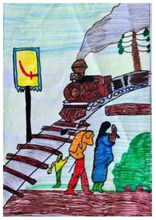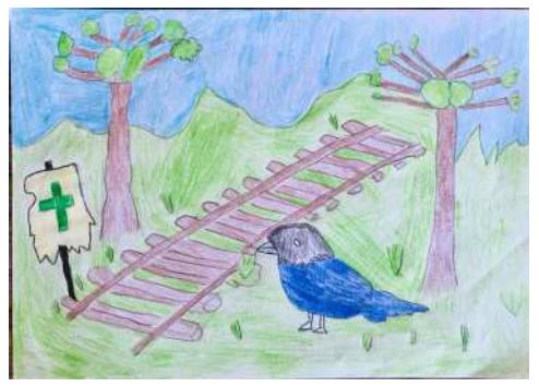 O último desenho em destaque volta ao primeiro trabalho aqui apresentado. Trata-se de um pássaro azul solitário diante do trilho da estrada de ferro. Ele olha para o expectador/a do desenho. Nas duas margens foram incluídas araucárias imponentes, tendo à esquerda uma bandeira com a cruz verde ao centro. É a gralha azul. Essa mesma ave aparece no desenho do Mateus (Imagem 1). Se voltarmos a ele e afinarmos nosso olhar para a araucária que aparece na margem superior direita do desenho, veremos o pássaro repousando no galho da árvore.
