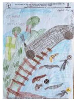 Convém registrar que até hoje, nos campos do planalto catarinense, projéteis da época da guerra são encontrados por agricultores ao revolver a terra na intenção de preparar o solo para o cultivo. O museu do Jagunço, em Fraiburgo (SC), foi construído tendo como acervo básico esses objetos da cultura material de origem bélica encontrados na região (Silva, 2017). Desenho de Paulo Ricardo Goes, escola Princesa Isabel.