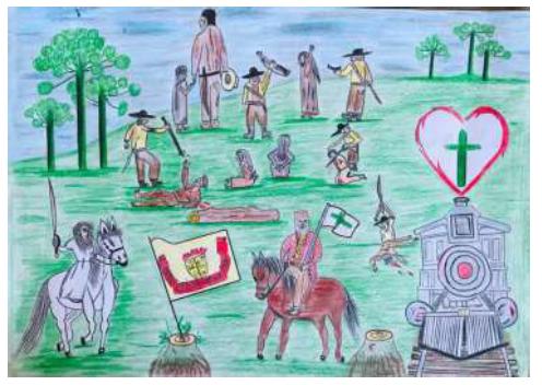 Escolher essa cena para representar o Contestado não é algo de somenos importância. O conflito é reivindicado pelos movimentos de luta pela terra que atuam na região onde esses desenhos foram produzidos. Já destaquei, em outro contexto, a importância do trabalho efetuado nas escolas de Lebon Régis, bem como o papel da Associação Cultural Coração do Contestado na atualização da memória e da história desse conflito rebelde (Rodrigues, 2021a). Filhos e netos de pequenos agricultores que vivem em assentamentos oficializados pelo Instituto Nacional de Colonização e Reforma Agrária (INCRA) convivem com os usos políticos do passado do movimento do Contestado. Esse contexto nos ajuda a compreender as escolhas efetuadas pela criança que fez a imagem 5. Também não se pode deixar de ressaltar o papel das/os professoras/as nesse processo. Sem a mediação dessas profissionais, esse exercício seria difícil de se concretizar ou, quem sabe, ganharia contornos menos políticos. O autor do desenho é Vitor Ferreira, 5º ano, estudante do núcleo Rio Doce.