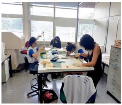 No âmbito desta discussão, as estudantes foram convidadas a colocar em prática procedimentos rotineiros do Laboratório de Conservação e Restauro do CMU, tais como atividades de higienização, conservação, restauro, acondicionamento de documentos. A importância da preservação e da conservação do acervo, de um patrimônio documental de grande relevância para a história da cidade de Campinas, de alguma forma, adquiria uma dimensão de concretude para aquelas jovens. Além da higienização de itens documentais, trabalharam com processos de encadernação e também de confecção de embalagens adequadas para o armazenamento de fotografias.