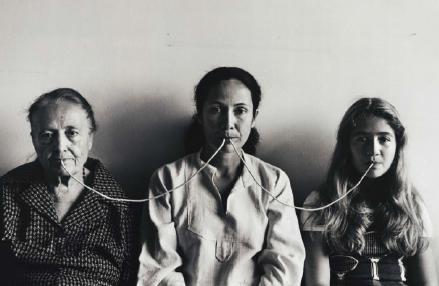 O mesmo silenciamento atravessa a obra de Anna Maria Maiolino. Em “Fotopoemações”, criação que envolve fotografias tiradas entre os anos 1973 e 2011, na qual há inúmeras performances de que a autora e sua família fazem parte, a artista também representa o silêncio, a permanência. Em “Por um fio” (1976), a artista posa ao lado de sua mãe e filha, sendo as três interligadas por um barbante: