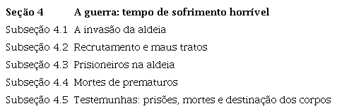 Intitulado “O sofrimento Aikewara”, o capítulo 8 está dividido em 8 seções, de onde foi selecionada a seção 4, “A guerra: tempo do sofrimento mais horrível”, para apresentação neste trabalho. Foi considerada a parte do capítulo com a maior quantidade de testemunhos e está dividida da seguinte forma, conforme o quadro 2: