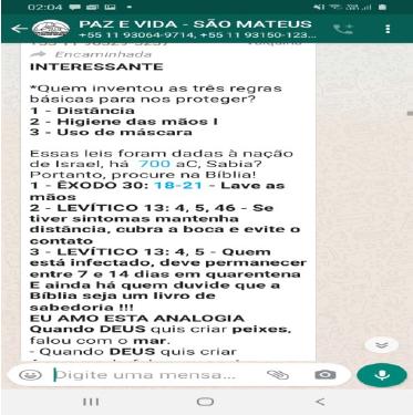 Nota-se que, nas conversas de texto pelo grupo de WhatsApp da Paz e Vida, se faz uso da religião como meio de orientação para as crises causadas pela Covid-19. Na imagem 2, observamos como os textos bíblicos são usados como auxílio na precaução do vírus.
