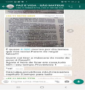 No Grupo de WhatsApp, observa-se mensagem no sentido da preocupação de membros com o aumento de mortes que ocorreram devido ao alto pico da pandemia. Aqui, novamente o adepto direciona a mensagem por meio de textos bíblicos, quando comenta que são “quase 4.000 mortes por dia, temos que nos isolar. Parem de negar fatos!!! Quem vai tirar a máscara do rosto é Deus”. E termina o texto com a afirmação de que “é hora de ficar em casa, tudo tem seu tempo”, com referência as Escrituras. Novamente, percebe-se que as orientações devem ser seguidas, porque Deus fala.