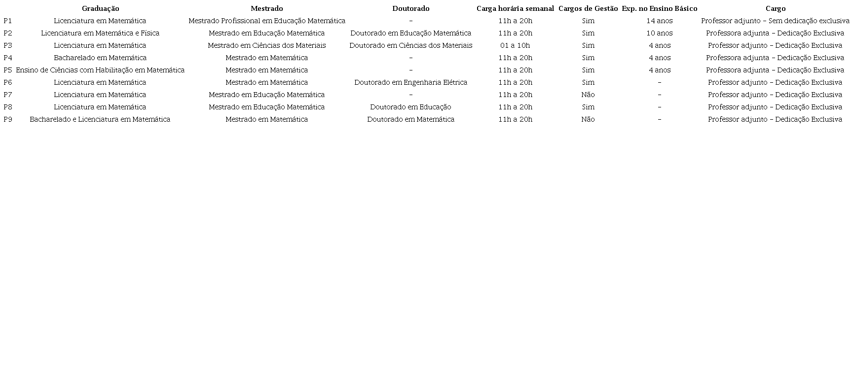 A seguir, apresentamos um quadro sobre a formação e o tempo de experiência de cada formador envolvido.