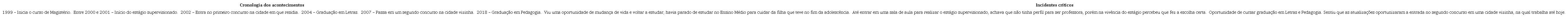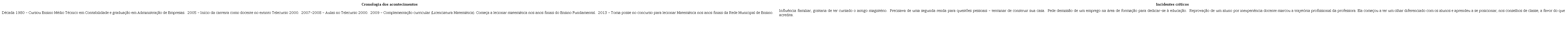 Nos biogramas, organizamos na primeira coluna, em ordem cronológica, os dados dos fatos que marcaram a vida profissional das professoras entrevistadas - início da carreira, como se deu a escolha da profissão e por que decidiu seguir a carreira docente - e um momento que marcou sua vida profissional; e, na segunda coluna, registramos se esse fato tem caráter de incidente crítico.