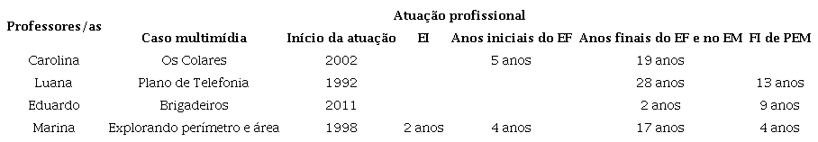 Os quatro professores investigados são licenciados em Matemática, cursaram Mestrado e Doutorado na área de Educação ou de Educação Matemática, são membros do Gepefopem e protagonistas na elaboração de casos multimídia. Em sua trajetória profissional, atuam/atuaram na Educação Básica (Educação Infantil - EI, Ensino Fundamental - EF e Ensino Médio - EM) e na formação inicial (FI) e continuada (Quadro 2):