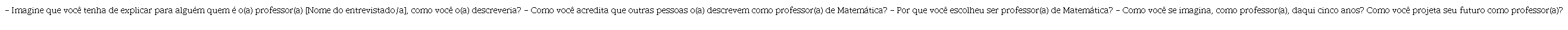 As entrevistas envolveram, inicialmente, 11 questões relacionadas à trajetória profissional desses professores, focando sua experiência, sua formação inicial e continuada, e elementos pessoais e profissionais relacionados ao seu trabalho. No presente artigo, são analisadas respostas a quatro dessas questões (Quadro 3).