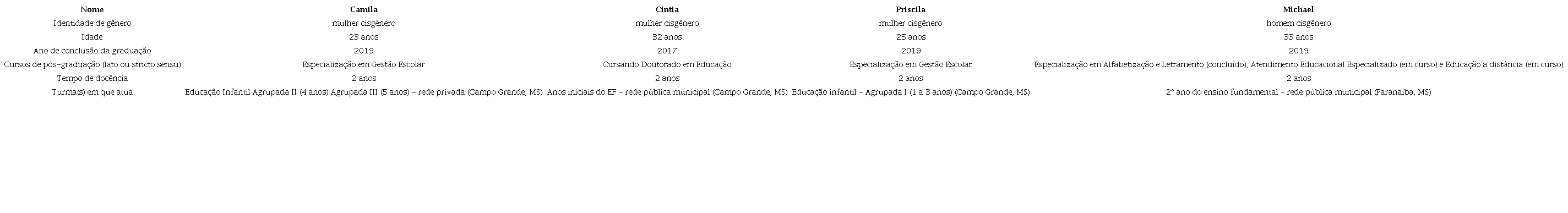 No quadro 1, trazemos o perfil geral de cada entrevistado(a), para que se entenda um pouco mais sobre sua história formativa e vivência como docente.