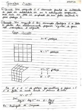 Na minha primeira aula da disciplina de Geometria, no dia dezenove de agosto de 2016, fui apresentado formalmente à Geometria Fractal. Registros do meu caderno nessa ocasião são apresentados na imagem 2.