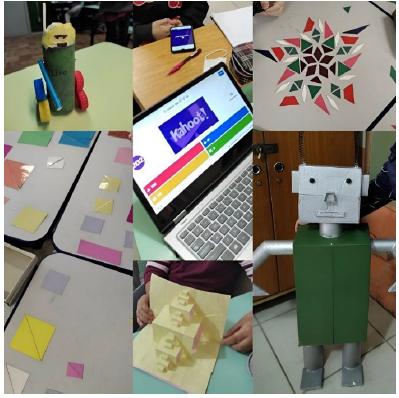 Meus alunos já produziram fractais e estudaram potências a partir do que aprendi nas disciplinas de Geometria; já utilizaram muito da sua inventividade na criação de personagens utilizando e reconhecendo elementos geométricos; já jogaram; montaram quebra-cabeças geométricos; leram e aprenderam de diferentes formas. Muitas dessas práticas advêm de saberes que aprendi em minha jornada pelo Grupo, ao longo desses oito anos. A imagem 5 ilustra algumas delas.