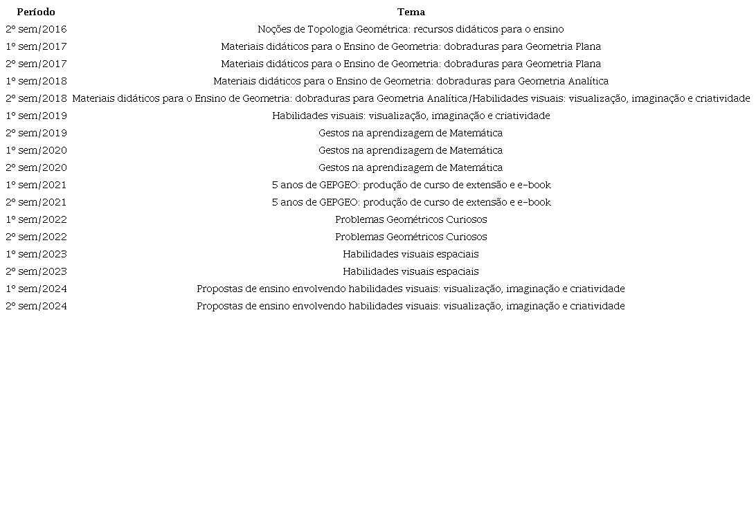 Em sua configuração atual, o GEPGEO conta com, além de todos os participantes já citados, professores da rede pública e privada de municípios distintos de Santa Maria, e de outros estados; docentes e alunos de graduação em Matemática de diversas IES, como da Universidade Federal de Santa Maria (UFSM); entre outros. Ao longo desses anos, muitos temas já foram explorados pelo grupo, conforme apresentado no quadro 1.