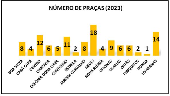 O bairro com o maior número de praças é o Neves, com dezoito; o bairro com o menor número é o Ronda, com apenas uma praça, fato que chama atenção pois é nesse bairro onde se concentram as atividades de gestão pública (Prefeitura, Câmara dos Vereadores, Receita Federal e Agência da Previdência Social), serviços que geram grande circulação de pessoas, incluindo a estação rodoviária da cidade. Na imagem 2, é possível notar que um dos bairros mais extensos, o Cará-Cará, tem apenas quatro praças; e um bairro menos extenso, como o Centro, conta com doze praças distribuídas por seu perímetro. Percebe-se que quanto mais longe do “centro” urbano menor é o número de praças nos bairros. O número total de praças em cada bairro está demonstrado na imagem a seguir.