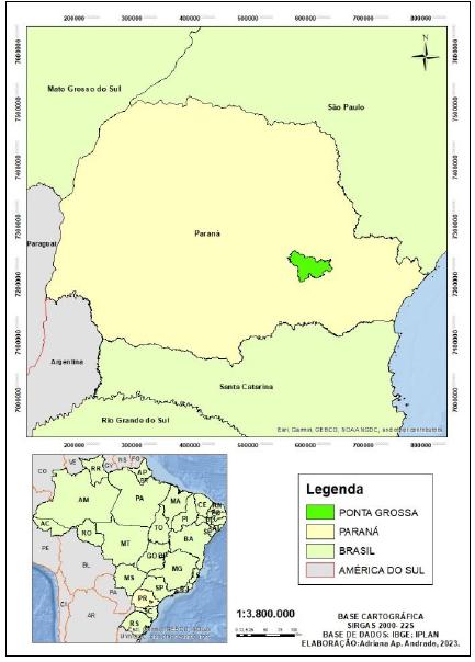 O município de Ponta Grossa está situado no Segundo Planalto Paranaense (Imagem 1), compõe a região dos Campos Gerais, é reconhecido por suas paisagens e potencialidades naturais e turísticas, como o Parque Estadual de Vila Velha e o Parque Nacional dos Campos Gerais. Até hoje, é um importante entroncamento rodoferroviário e localidade de grandes indústrias do ramo alimentício, com destaque nacional. No último Censo, em 2022, a população de Ponta Grossa chegou a 358.367 pessoas (IBGE, 2022).