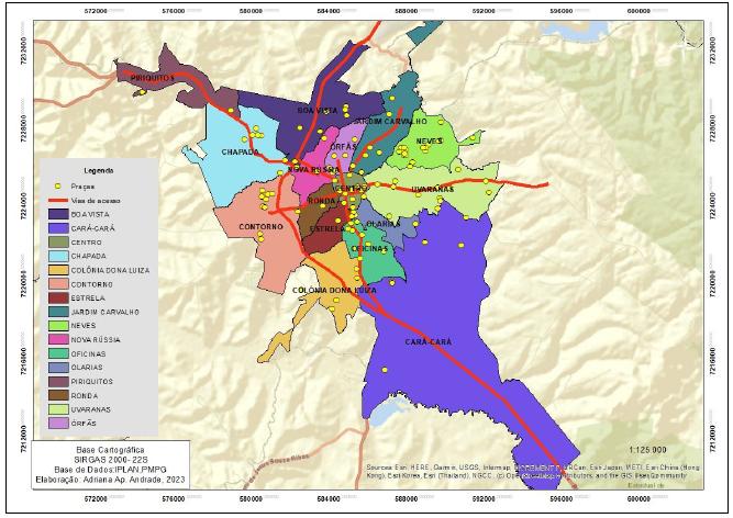 No perímetro urbano de Ponta Grossa, no ano de 2023, existem ao todo cento e dezesseis (116) praças de diferentes tamanhos e formas, como já afirmado, algumas mais preservadas e equipadas que outras. A imagem 2 apresenta a distribuição das praças no município.