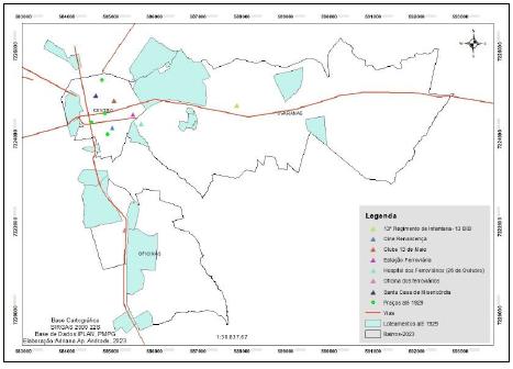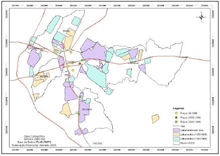 A imagem 8 apresenta a distribuição espacial dos loteamentos e praças criadas de 1970 até 2022, nesse período, foram criadas noventa e sete praças, nessa figura é possível perceber que vários loteamentos ainda permanecem sem nenhuma praça.