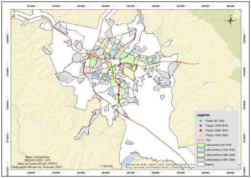 Nessa segunda fase de expansão, não há a criação de praças. A imagem 5 apresenta a localização dos novos loteamentos e as praças existentes, nota-se que as atividades de lazer ainda se concentravam nos equipamentos culturais existentes no Centro.