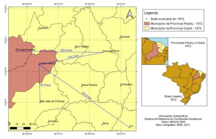 O mapa 220 permite visualizar as distâncias com a província vizinha e entre espaços afetados nesta última pelo cólera, como Quixeramobim, segundo Lemos (2016), bem como Tauá21 e Icó, outras localidades existentes na província do Ceará e que segundo o relatório de 13 de junho de 1862 do Dr. Antonio de Britto Souza Gayozo (Piauhy, 1862a) também foram afetadas pela epidemia do cólera naquele ano.