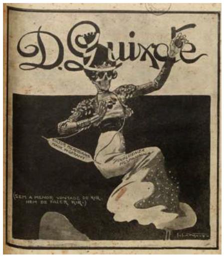 A capa da revista “D. Quixote” supracitada evoca esse imaginário. No entanto, ao contrário das famosas vestes negras e a foice (ou gadanha), a Influenza de Julião Machado usa trajes típicos flamencos, com castanholas nas mãos. Como doença altamente mortífera, ela encarna muito bem a alegoria da Morte, mas agora tem um “passaporte”, ganhara costumes e uma nação para si. Nada mais propício para essa atribuição de identidade do que os tempos de nacionalismo exacerbado do início do século, que em 1918 finalmente via o desfecho de uma Grande Guerra fruto desses “ideais” - e que também em grande medida fora a responsável pela dimensão da gripe, que se alastrou junto à movimentação dos exércitos. Apesar do nome, sua origem não estava na Espanha, como se acreditava. Os especialistas apontam que, em contraposição à censura imputada à imprensa pelos países que se confrontavam durante a Primeira Guerra Mundial, a Espanha, neutra no conflito, não se furtou de noticiar nos jornais os casos da estranha doença que assolava o seu território, acabando por popularizar a doença como se fosse “sua” (Crosby, 2003; Goulart, 2003; Mauad, 2020a).
