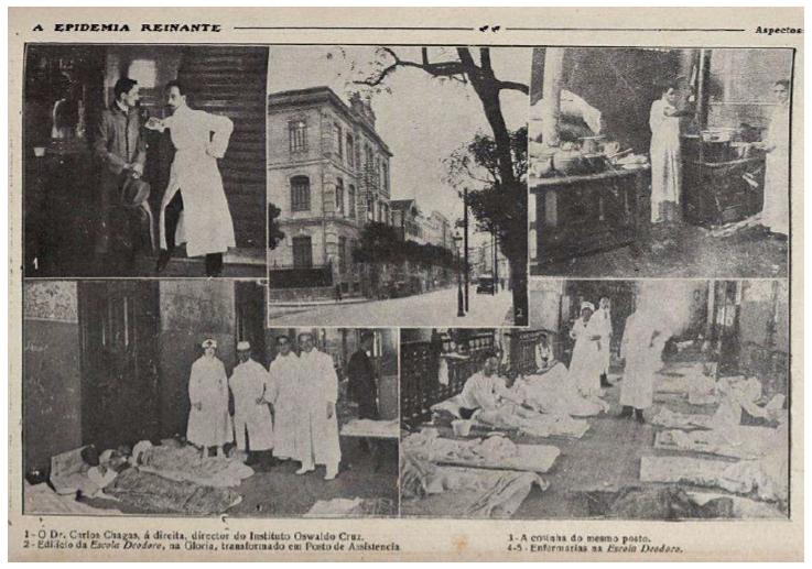 Com o aumento preocupante de casos, muitas escolas, que tiveram suas atividades suspensas, tornaram-se de repente hospitais, com pacientes espalhados pelo chão até mesmo de cozinhas, como outros testemunhos fotográficos nos apresentam (Imagem 10). Retornamos aqui ao testemunho de Pedro Nava ao falar daqueles que miseravelmente não sobreviveram aos cuidados domésticos ou aos precários atendimentos dos hospitais: