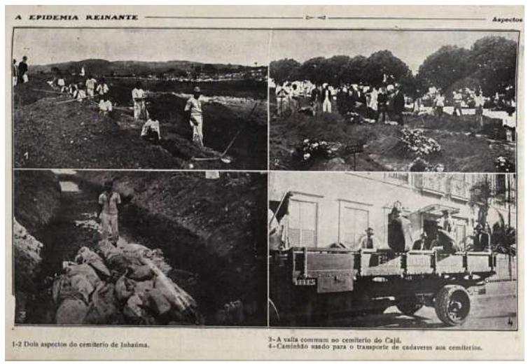 Além da fome, da falta de remédio, de médicos, de tudo, as folhas noticiavam o número nunca visto dos doentes e cifras pavorosas do obituário. As funerárias não davam vazão - havia falta de caixões. [...] não tinha quem os transportasse e eles iam para o cemitério à mão, de burro [...], arrastados, ou atravessados nos táxis. No fim os corpos iam em caminhões, misturados uns aos outros (Nava, 2001, p. 211).