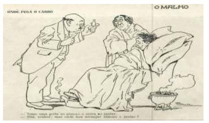 Em “Onde pega o carro”, na revista “O Malho”, Raul Pederneiras ilustrou uma dessas questões (Imagem 13). Na charge, um homem visivelmente doente, cabelos despenteados e olhos fundos, envolto a lençóis, travesseiros e outros recursos para se manter aquecido, tem ao seu lado a esposa a escutarem as instruções do médico, que ergue um pequeno frasco de remédio: “- Tome uma gotta ao almoço e outra ao jantar. - Sim, senhor; mas onde vou arranjar almoço e jantar?” (Pederneiras, 09 nov. 1918, p. 21). A quebra de expectativas junto ao leitor pela resposta do doente, que nem sequer poderia regular os horários do remédio pela falta das refeições, é justamente onde residiria o humor da charge. Ela revela, todavia, o ponto central: a fome por que passava a população urbana, desencadeada pelo desabastecimento e inflação dos gêneros alimentícios com a peste.