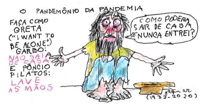Mais lamentável que as privações atravessadas pelos contemporâneos da Gripe Espanhola em 1918 é constatar que muitas delas sejam factíveis na pandemia de Covid-19 hoje, ainda que separadas por um século. É reprovável que meras advertências para lavar as mãos sempre que possível, evitando o contágio do vírus, possam revelar uma distinção de classe, ponto presente na charge “Covid-19 nas favelas” de Luiz Fernando Cazo, publicada no “Blog do AFTM” em abril de 2020 (Cazo, 2020a, 2020b). A quebra de expectativa do autor segue a mesma lógica da ilustração de Raul Pederneiras em “Onde pega o carro”. Antes de sabão ou álcool em gel para higienização, onde haveria água? Irônico é pensar no quanto as recomendações para “permanecer em casa” escancaram o profundo abismo que divide a sociedade brasileira entre aqueles que possuem um lar e os que vivem na rua, como nos atentou o caricaturista Jaguar em “O pandemônio da pandemia”, charge publicada na “Folha de São Paulo” em abril de 2020 (“Folha de S. Paulo”, 03 abr. 2020).