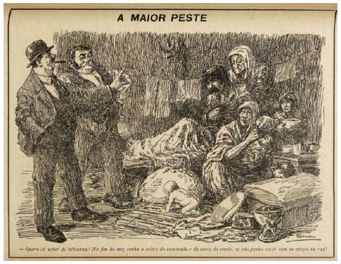 Assim como os redatores e fotógrafos das revistas, os caricaturistas também não ficaram inertes ao doloroso cotidiano da capital, retratando em seus trabalhos, com mais ou menos humor, o que se podia ler nas notícias. Para além dos vários trocadilhos com a palavra “influenza” e “hespanhola”, encontramos caricaturas sobre a má ação dos governantes e a ação nada humanitária de médicos, farmacêuticos e comerciantes de alimentos. Outras, por sua vez, envolvem diretamente a doença e as desigualdades sociais, como a fome, a falta de recursos para pagamento de remédios, a impossibilidade de medidas profiláticas pela carência de higiene ou o trabalho compulsório de populares nos cemitérios.