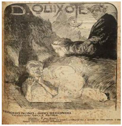 São inúmeras as charges e ilustrações que tematizaram na imprensa a ineficácia do governo da época em combater a gripe espanhola, focalizando principalmente os dois personagens. Mas há uma em especial que vale a pena a atenção, publicada em outra capa da Revista “D. Quixote” em 30 de outubro (Imagem 17). Realizada por Calixto Cordeiro, combina sátira política e cultura erudita, renovando a tradição clássica ao conferir novos sentidos a uma obra separada de Calixto por mais de quatrocentos anos: a “Divina Comédia”, de Dante Alighieri. “Círculo nono, segunda esfera: traidores da pátria” é o título da ilustração, traduzido do italiano. Remete diretamente às visitas de Dante, guiado por Virgílio, às profundezas do Inferno. Entre escarpas rochosas, de ângulos agudos e traços febris, Calixto desenha Dante curvado a observar o sofrimento de um culpado - ou seria uma vítima? - no último círculo do Inferno, o nono, onde habitaria toda a sorte de traidores. “- E este, mestre?” - pergunta Dante acerca dos motivos que levaram aquele sofredor à região onde se encontravam os mais graves pecadores. “- É também um traidor” - responde Virgílio - “confiaram-lhe a guarda de uma cidade e ele deixou entrar o inimigo devastador” (Cordeiro, 30 out. 1918, capa).