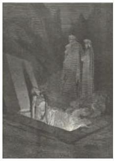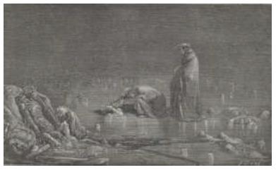A fisionomia característica do sofredor não deixa dúvidas: trata-se de Carlos Seidl, considerado por Calixto um “traidor da pátria” por ter permitido a entrada da Peste. Ele se encontra em uma espécie de alcova fumegante, de onde observa subir do fundo espessa fumaça; suas mãos tensas cravadas sobre os ombros indicam agonia. A referência visual de Calixto para a composição da cena é quase inequivocamente Gustave Doré, que ilustrou uma popular edição do livro no século XIX. Curiosamente, contudo, se Calixto acertou a região do Inferno relativa aos traidores da pátria - de fato o nono círculo, segunda esfera, conforme a literatura -, não representou o sofrimento correspondente, narrado na obra como o lago congelado Cócito (Imagem 18). Calixto ilustrou o sexto círculo, onde sofrem no fogo os hereges (Imagem 19). Menos um equívoco do que uma escolha retórica, o ilustrador pode ter optado por essa representação a fim de aproximar as expectativas dos leitores da revista acerca dos sofrimentos do Inferno - ainda hoje muito associados ao fogo.