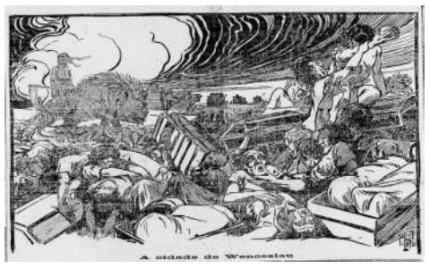 O destino de seu presidente, é claro, não deveria ser muito diverso. Calixto Cordeiro, de novo, foi quem trabalhou o tema, embora de forma menos direta. A imagem foi estampada com destaque na primeira página do jornal “Gazeta de Notícias” de domingo (Imagens 20), circundada por manchetes trágicas: “A vida por um fio”, “O descalabro da Saúde Pública”, “A caminho da fome!”, “Desinfecção!”. Naquela edição, a “Gazeta” estimava mais de quinhentas mortes na cidade, apenas referentes ao dia anterior (Cordeiro, 27 out. 1918). A imagem de Calixto não representa propriamente a figura de Wenceslau Brás, mas a condição pavorosa da cidade expressa na ilustração seria representativa de sua inação, ou seja, de sua responsabilidade, como atesta o título “A cidade de Wenceslau”. Nela, um mar de pessoas empilhadas, mortas e vivas entre caixões, domina a cena, digna de mais um dos círculos do Inferno de Dante. À direita, um grupo se distingue dos demais enquanto disputa por algo pouco identificável - talvez um pedaço de pão, considerando os casos de fome registrados. Eles disputam por sua sobrevivência, evocando vagamente a famosa composição de Géricault em “A balsa da Medusa”, de 1819, onde os náufragos se unem em um último suspiro de energias para um pedido de resgate ao navio no horizonte. Ao fundo da ilustração de Calixto, eis a figura da Peste, por entre nuvens fétidas e contagiosas que evaporam de si, contaminando os habitantes. Assemelha-se a um cavaleiro do Apocalipse: possui um aspecto esquelético, porta a gadanha da morte, e monta uma besta mamífera sedenta por devorar os corpos à sua frente.