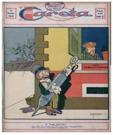 De repente, Rodrigues Alves aparecia na imprensa como o nome certo na hora certa; alguém capaz de promover melhorias na saúde pública e erradicar a doença. É como o apresentara Raul - sob o pseudônimo de OIS (Silva, 2014) - na “D. Quixote” de 6 de novembro, claramente apontando qual “a política que a Pátria espera[va]” do novo presidente: a vacinação contra a Gripe (Imagem 22). Rodrigues Alves e a vacina também aparecem associados na ilustração de capa da “Careta” por J. Carlos, dias depois (Imagem 23). Nela, o futuro presidente segura uma enorme seringa para vacinação, mas a utiliza curiosamente como um violão para, em serenata, conquistar (ou convencer) a coroada e desconfiada Madame Sebastianópolis em sua casa, uma clara alegoria à cidade do Rio de Janeiro. Ironicamente, no entanto, Rodrigues Alves não resistiu à doença que a opinião pública tanto esperava que ele eliminasse, falecendo em janeiro de 1919.