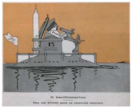Duas ilustrações anteriores, publicadas nas revistas “Careta” (1908-1960) e “O Malho” (1902-1953), reforçam a ideia de uma conspiração germânica sobre a epidemia. Em “O bacillomarino” (Imagem 3), veiculada em 5 de outubro na “Careta”, o ilustrador anônimo - os traços indicam ser J. Carlos - faz uma alusão aos submarinos da Guerra como difusores da Influenza hespanhola, complementado pela legenda, que associa a doença como aliada dos Impérios Centrais, liderados pela Alemanha. Na imagem, a figura da Morte novamente é associada à pandemia. Ainda na mesma edição, a “Careta” apresentava um discutível testemunho incriminando a Alemanha. Em uma das passagens, afirmava-se: “em nossa opinião a misteriosa moléstia foi fabricada na Alemanha, [...] engarrafada e depois distribuída pelos submarinos que se encarregam de espalhar as garrafas perto das costas dos países aliados” (Careta apud Goulart, 2003, p. 28). Sem assinatura, originalmente redigido em um francês aportuguesado, o texto ganharia um caráter cômico, revelando, conforme Adriana Goulart (2003, p. 28), o grau de desinformação da sociedade sobre a seriedade com que se deveria tratar a doença. Para além disso, sustentamos, ao coligir essas opiniões expressas em imagens e textos, identificamos claramente uma yellow press mais interessada na exploração comercial dos fatos que propriamente comprometida com eles.