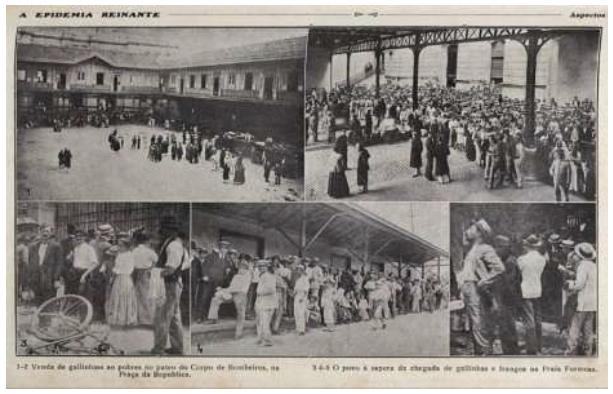 De um momento para o outro viu-se a população completamente privada do pão, da carne, do leite e das aves, que lhe eram indispensaveis. Centro de grandes recursos, servido por enorme teia de linhas terrestres e maritimas, que o ligam a uma infinidade de centros produtores; tendo em toda a sua area estabelecimentos para a vendagem de todas essas mercadorias, a capital da Republica apresentou durante muitos dias - e ainda apresenta, em parte - o aspecto de uma cidade sitiada por feroz inimigo, disposto a obter-lhe a rendição pela fome! (“O Malho”, 02 nov. 1918, p. 20).