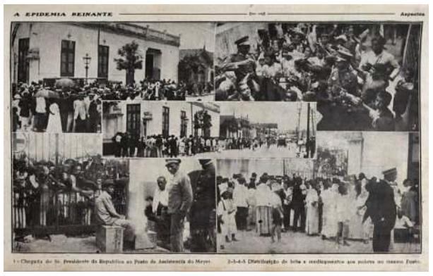 Em uma das fotografias é possível reconhecer a empolgação sincera de crianças erguendo garrafas vazias para que fossem abastecidas pelo encarregado da assistência. Em outras, vemos olhares caídos mirando o interesse do fotógrafo. Conforme adverte Ana Maria Mauad (2020), o caráter realista dessas imagens, publicadas na revista como uma narrativa visual (que prescinde de textos), favorece a sua interpretação como “janela” para os acontecimentos, isto é, adquire valor de verdade, e consolida uma “visualidade para o acontecimento” construída coletivamente pela imprensa. Já para nós, diante dessas imagens hoje, parece inevitável pensar no quanto o contato próximo entre aquelas pessoas, seus corpos pressionados contra o portão ou amontoados nas filas, devia favorecer a propagação da doença, em situações familiares àquelas acarretadas no presente, também motivadas pela urgente necessidade de manutenção dos lares. Os casos de saques do auxílio emergencial nas agências bancárias é um exemplo (Mendonça; Rossi, 2020).