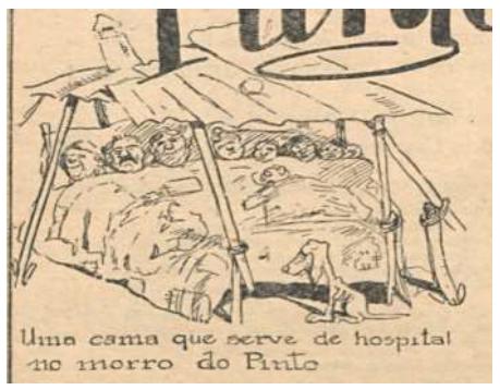 É bom que se lembre que não havia um Sistema Único de Saúde como hoje. A cobertura assistencial médica gratuita e para todos não era bem uma responsabilidade pública, e salvo no caso do atendimento em instituições de caridade como as Santas Casas de Misericórdia, o acesso a tratamentos de saúde era predominantemente de caráter privado, inacessível a maior parcela da população brasileira. A revista “O Malho” ofereceu ao público uma cena caricatural desenhada por Yantok que parece dar uma dimensão da miséria e desamparo no qual a população pobre enfrentava a epidemia (Imagem 9). Amontoados em uma cama, sob uma estrutura que denota grande precariedade, um grupo de sete pessoas e um bebê, tendo ao lado seu fiel e esquelético cão, parecem aguardar sua hora no “morro do Pinto”.