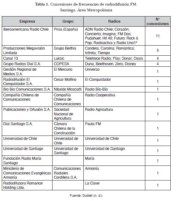 Según la estructura de propiedad, el mercado de la radiodifusión chilena tiene cuatro conglomerados relevantes: Iberoamerican Radio Chile (11): Concierto, Activa, ADN, 40 Principales, Imagina, Pudahuel, Futuro, Rock and Pop, Uno, FM Dos y Corazón; Grupo Luksic (5): Teletrece Radio, Horizonte, Oasis, Play y Sonar; El grupo Bethia (5) luego de adquirir el canal de televisión Megavisión tomó el control de Radio Candela, y luego de las radios Carolina, Romántica, Infinita y Tiempo. Grupo Dial (4): Beethoven, Duna, Disney y Zero; Luego, todas las demás empresas radiales poseen solo una concesión, como la Compañía Chilena de Comunicaciones (radio Cooperativa), Sociedad Nacional de Agricultura (Agricultura), Biobío Comunicaciones (Red Bio-Bío) y la familia Molfino (El Conquistador), entre otros. El grupo Edwards, dueño de la cadena El Mercurio, se ha expandido a regiones con red Positiva FM y Digital FM, también adquirió Universo. Asociaciones gremiales poseen empresas de radiodifusión como la Sociedad Nacional de Agricultura y más recientemente, en el año 2017, la Cámara Chilena de la Construcción. También dos universidades públicas, como la Universidad de Chile y la Universidad de Santiago tienen empresas de radiodifusión en la ciudad de Santiago. La configuración del mercado de la radiodifusión acredita la ineficacia de las escasas reglas que cautelan la libre competencia, como las atribuciones que tiene en dicho campo, tanto la FNE como del TDLC.