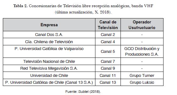 La televisión de libre recepción en Chile fue reservada en sus inicios en forma exclusiva al Estado y a las tres universidades más importantes del país. Dicho diseño cambió sin reforma legal alguna. Dichas universidades conservaron la titularidad de sus concesiones y la nuda propiedad, traspasando el usufructo y la operación de sus señales, frente a lo cual, las autoridades de la libre competencia no pusieron reparo alguno. Las empresas que actualmente operan los canales de televisión de libre recepción pertenecen al Estado -Televisión Nacional de Chile-; a grupos económicos, -Mega por Grupo Beithia y Canal 13 por el Grupo Luksica empresas multimediales extranjeras, Chilevisión por Time Warner; UCV TV por GCO SpA y Telecanal a un conglomerado mexicano, cuya propiedad se ha vinculado a Ángel Gonzalez, según una denuncia en la FNE que se investiga actualmente, pues ya posee la concesión del canal La Red.