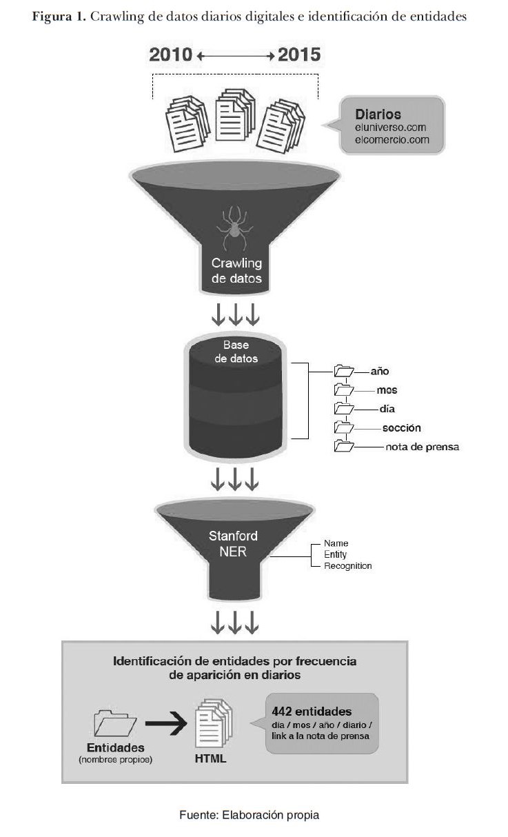 La selección de las notas de prensa se formuló mediante la implementación de un algoritmo de búsqueda con el que se extrajo de forma automática de los diarios mencionados las 2.203 notas de prensa para la posterior identificación de entidades. En el caso de El Universo, se seleccionaron las secciones: Noticias, Gran Guayaquil, Ecuador, Economía e Internacional; así se capturó el ámbito local como noticias de entretenimiento y asuntos coyunturales de interés nacional e internacional. Esto se realizó a partir de un patrón de registro hacia todas las URLs (Uniform Resource Locator) disponibles del sitio web: https://www.eluniverso.com. Gracias a que la página del diario presenta un servicio de archivos que habilita el acceso a las noticias del día a través de la fecha de publicación, este medio en versión digital permitió generar el patrón de búsqueda, que se hizo con el siguiente formato: http://www. eluniverso.com/servicios/archivo/AÑO/ MES/DIA.