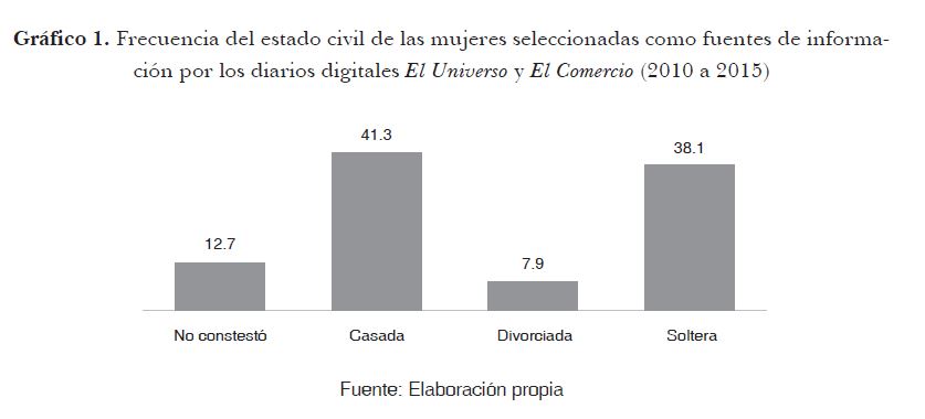 Los otros resultados de este artículo,también pueden ser analizados bajootras ópticas teóricas y metodológicas. El estado civil y la edad de estas 78 mujeres que son otros de los factores sociodemográficos que caracterizan a la representación de mujeres en los medios de comunicación tradicionales y no tradicionalespueden resultar interesantes para futuros estudios. Pese a un número creciente de contribuciones que reportan que las mujeres solteras y de menos edad están apareciendo más en los medios digitales (GMMP, 2015), en esta ocasión la mayoría son casadas y pertenecen al rango etario entre los 35 y 50 años. En otras palabras, son personas adultas, que poseen más experiencia que un estudiante universitario por la edad que tienen, y que están ubicadas en este segmento de la población que se reconoce como económicamente activo.