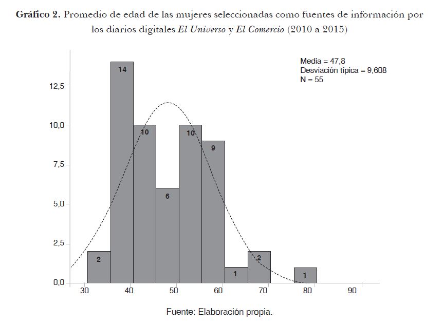 El promedio de las mujeres referidas por los medios digitales oscila entre los 40 y 50 años. Esto probablemente se podría asociar de modo positivo con la edad (35 a 49 años) de las mujeres ecuatorianas que aparecen como sujeto de la noticia en los medios (GMMP, 2015). Este rango etario que se considera